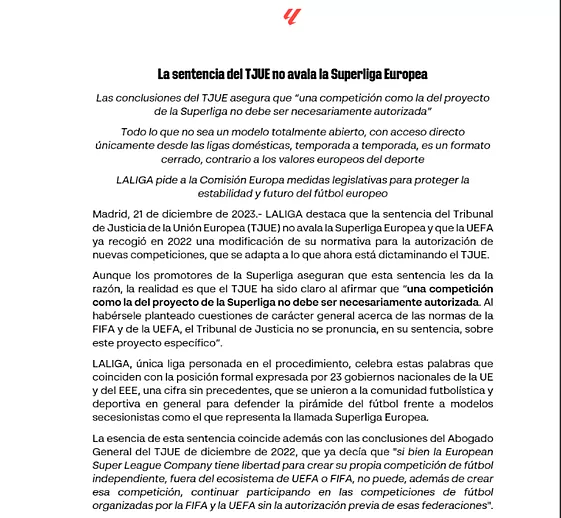 Así empieza un torrente de equipos españoles con el comunicado que les manda Tebas, quien se asienta como el gran mandatario en España con todos los clubes obedeciendo sus órdenes sin cuestionarse sus propios intereses, quienes viven hipotecados a CVC gracias a la nefasta gestión del abogado ahora presidente de La Liga. Por ello el Real Madrid se presenta como la única disidencia a la oligarquía de Tebas.