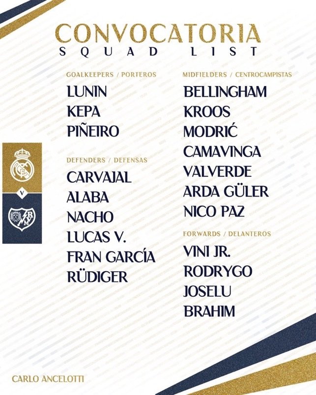 Real Madrid Anuncia su Convocatoria para el Enfrentamiento contra Rayo Vallecano